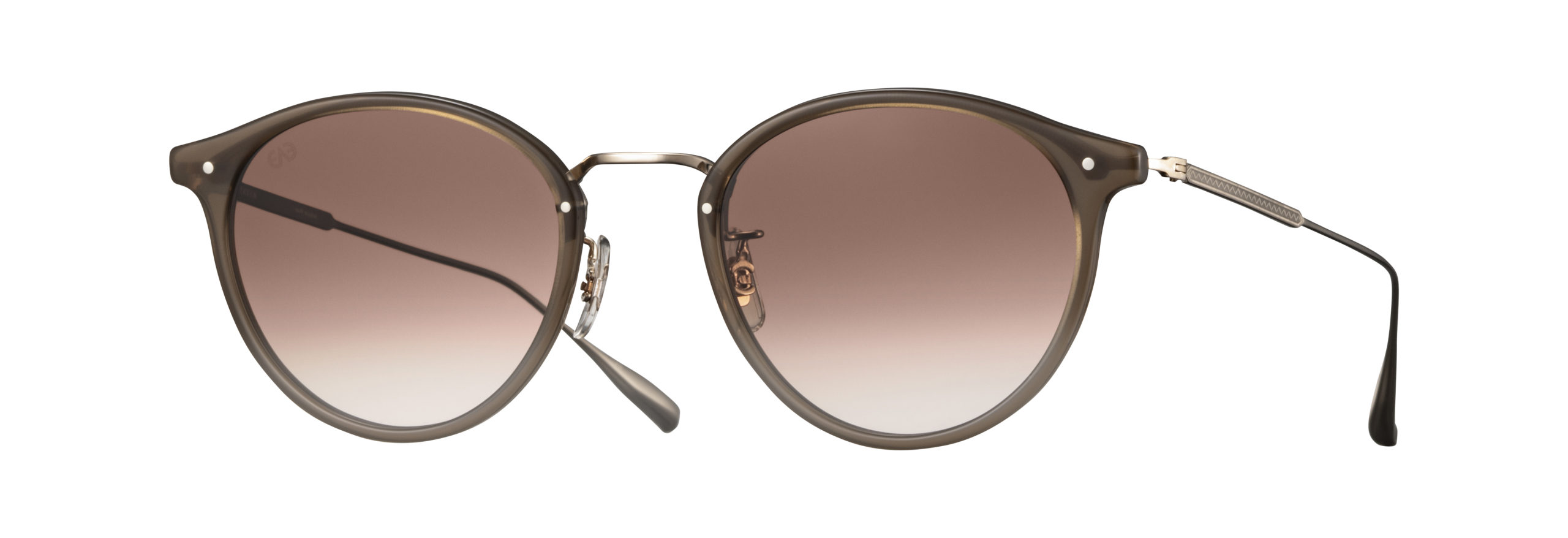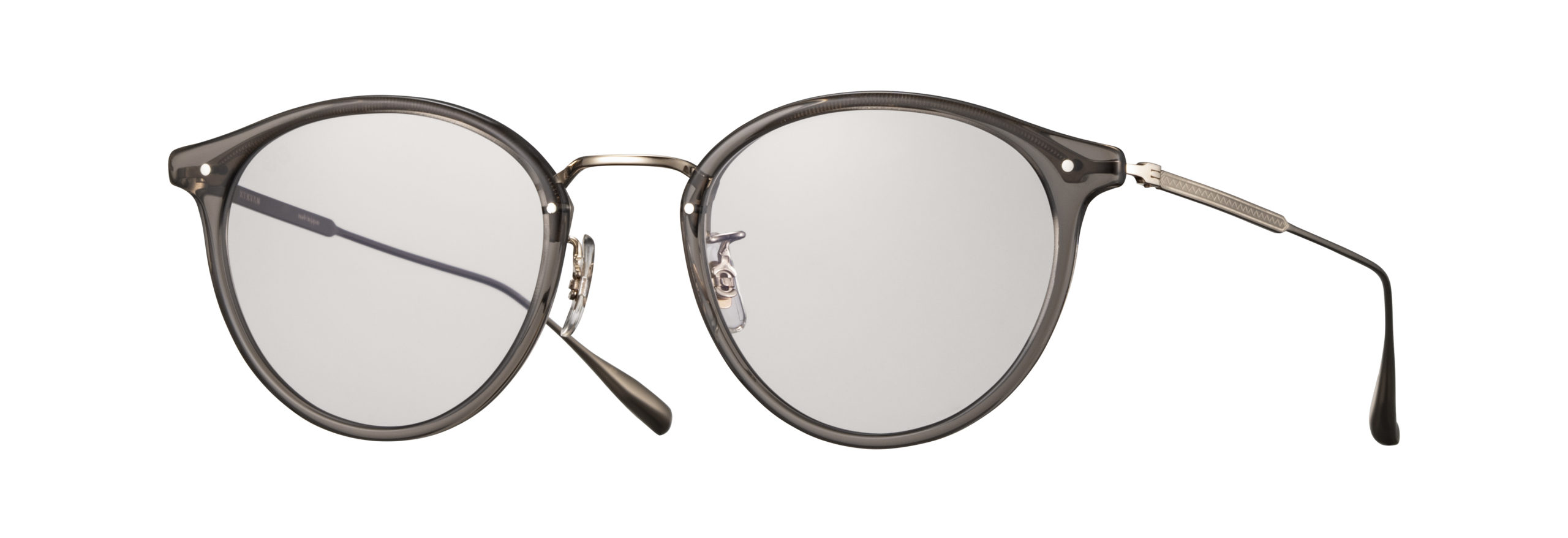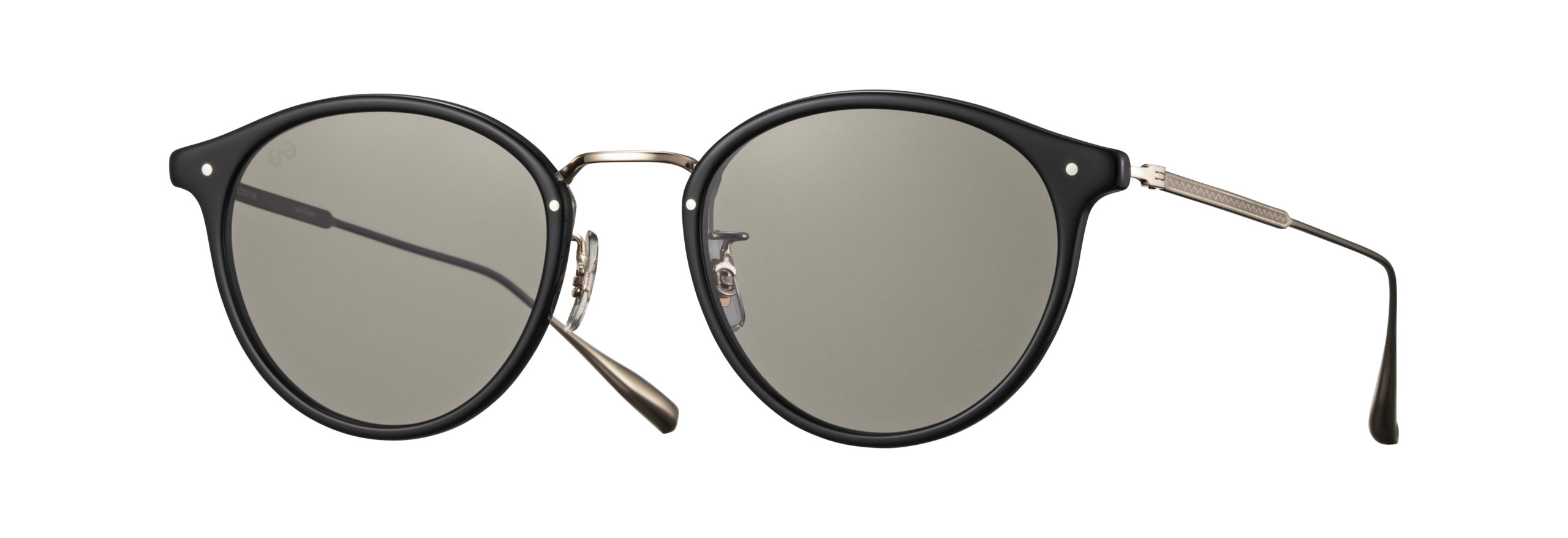 2020AWシーズンモデル『Acosta』の48サイズ、サングラスバージョン。熟練の職人によって、ロー付けを行わずプレスでミル模様を鮮明に入れながら別々のパーツの様に見せた一体型トップバーに、プラスチックのリムを合わせたコンビネーションフレーム。 ヨロイを限界の最短距離で曲げることによって、フレームにミニマルな雰囲気を出した。サングラスレンズはオリジナルのCR39 2カーブレンズを採用。