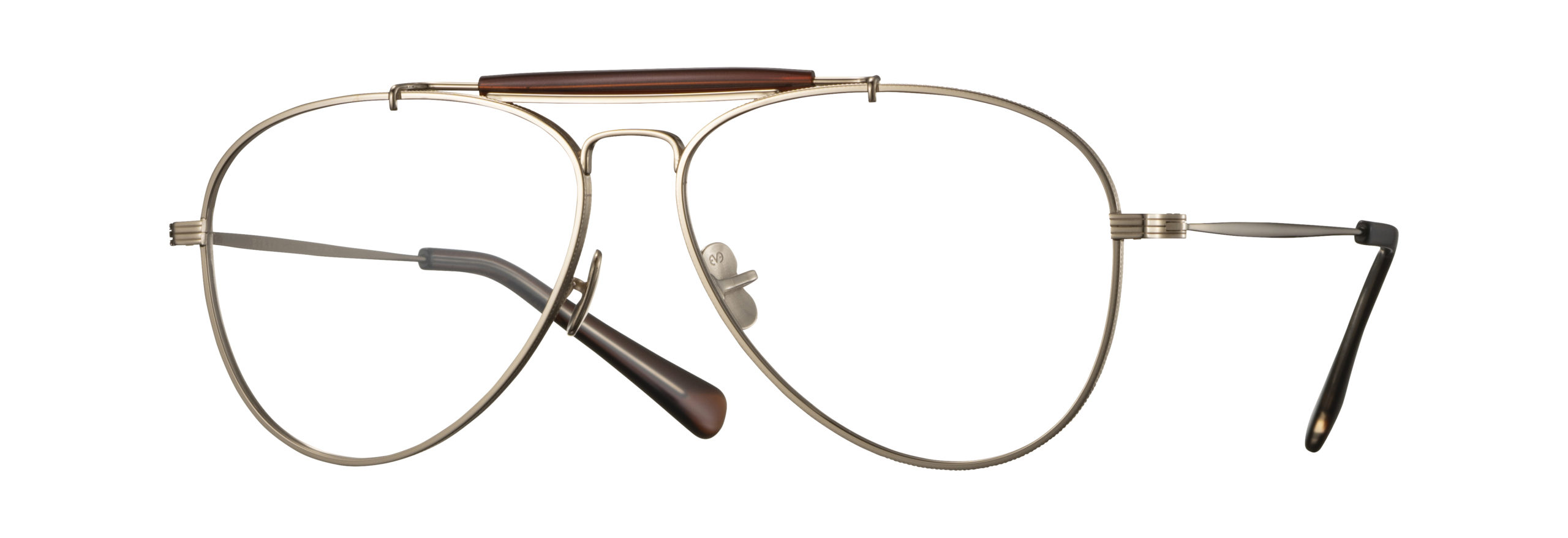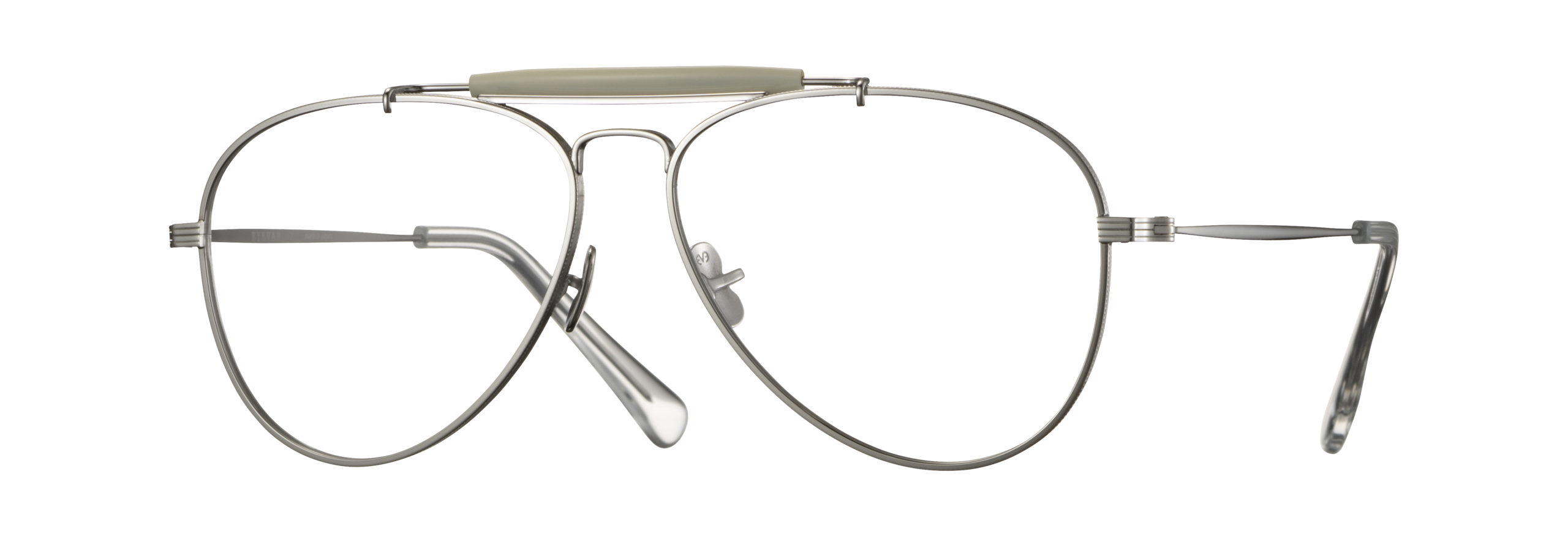 1960年代のアヴィエータースタイルのアメリカ製ヴィンテージフレームを着想源に、ミル模様とライン模様でデザインされたオリジナルリムによって現代的に再構築したモデル。通常より厚めに設計されたヨロイとわずかに起伏するテンプルはオリジナルリムのイメージに合うよう新たにデザインされたもの。PADには23SSコレクションでリリースされたEYEVANのシンボリックなチタンクリングス一体型PADを採用。モダンパーツには1980年代のフレンチヴィンテージからンスパイアされたデザインを合わせることでEYEVANらしいニューヴィンテージスタイルに仕上げた。